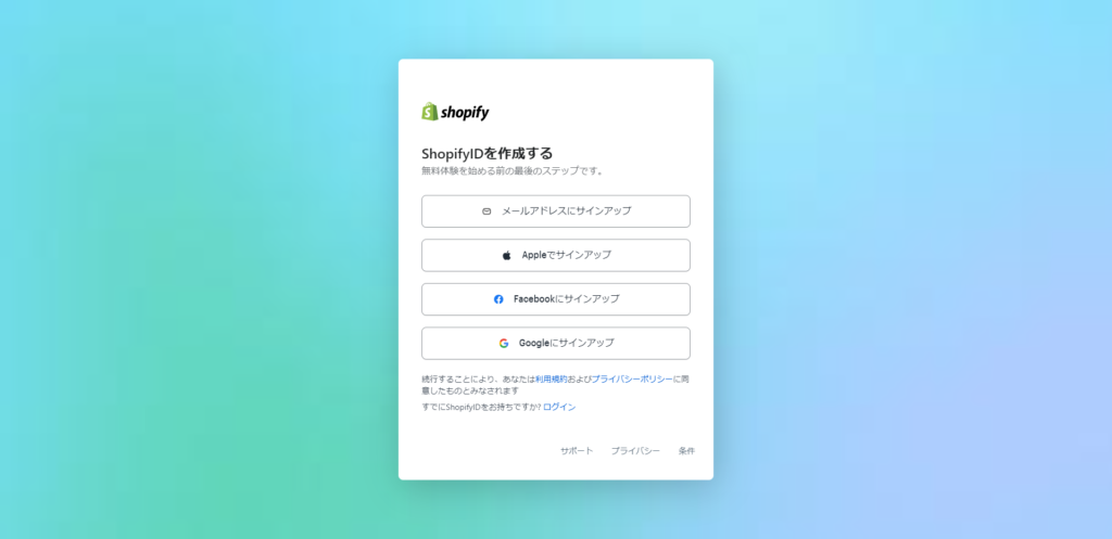 ShopifyIDの作成をします。メールアドレス、Apple、Facebook、Googleのいずれかでサインアップ可能です。
